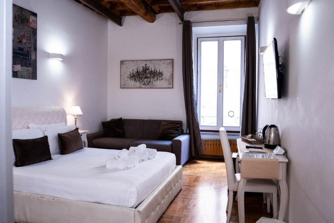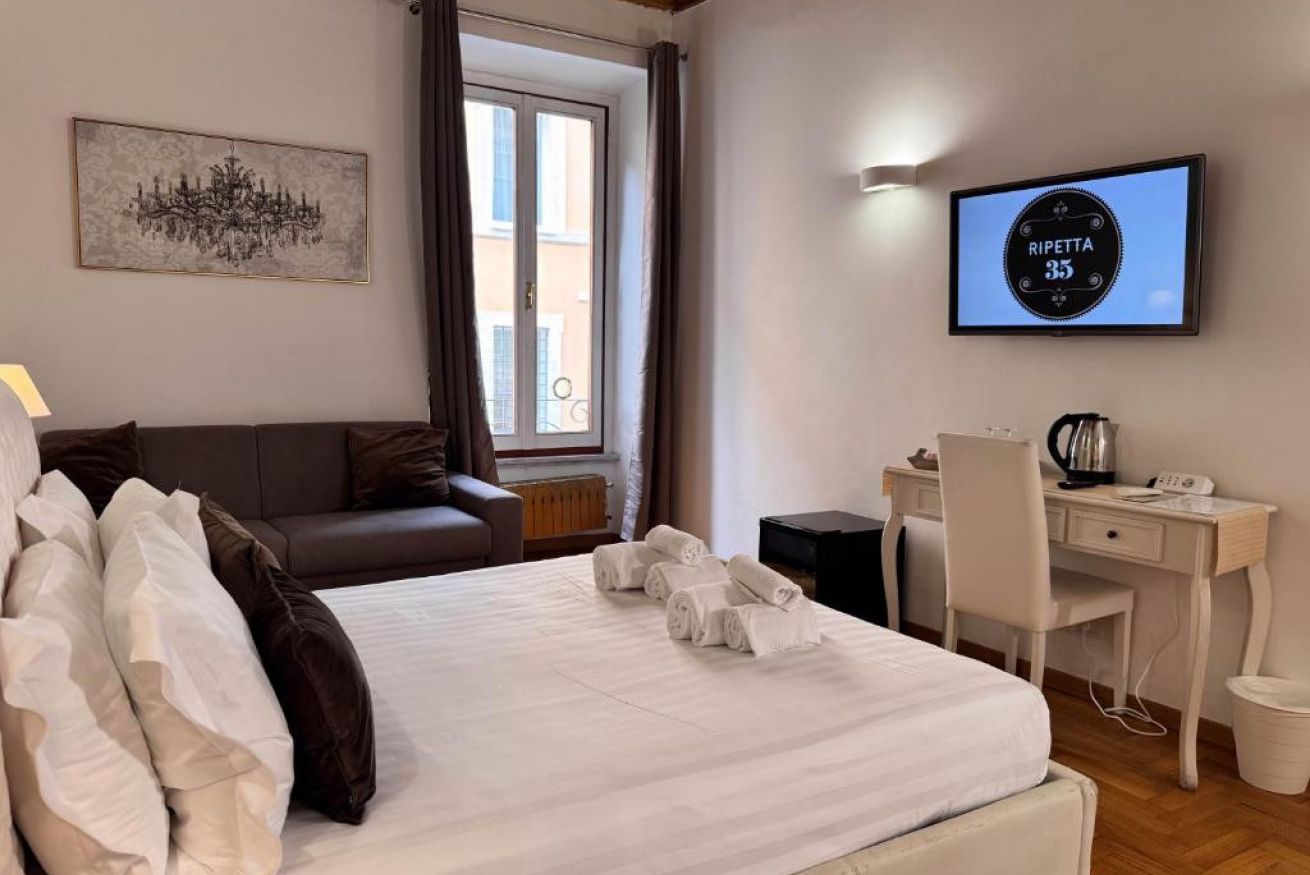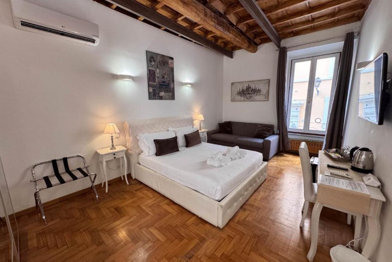 Spaziosa ed elegante camera con parquet ,travi a vista con bagno privato. Gode di tutti i confort come aria condizionata,wi fi gratuito, minibar, bollitore elettrico, asciugacapelli, set cortesia bagno, divano . Affaccio su Via di Ripetta . Soluzione perfetta per chi desidera spazio e confort nel centro della Città Eterna.