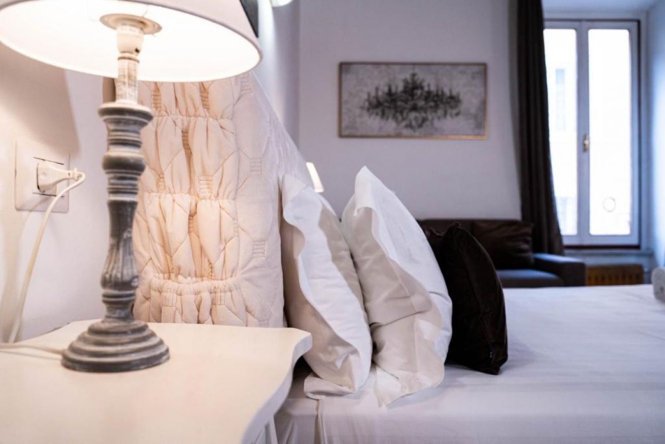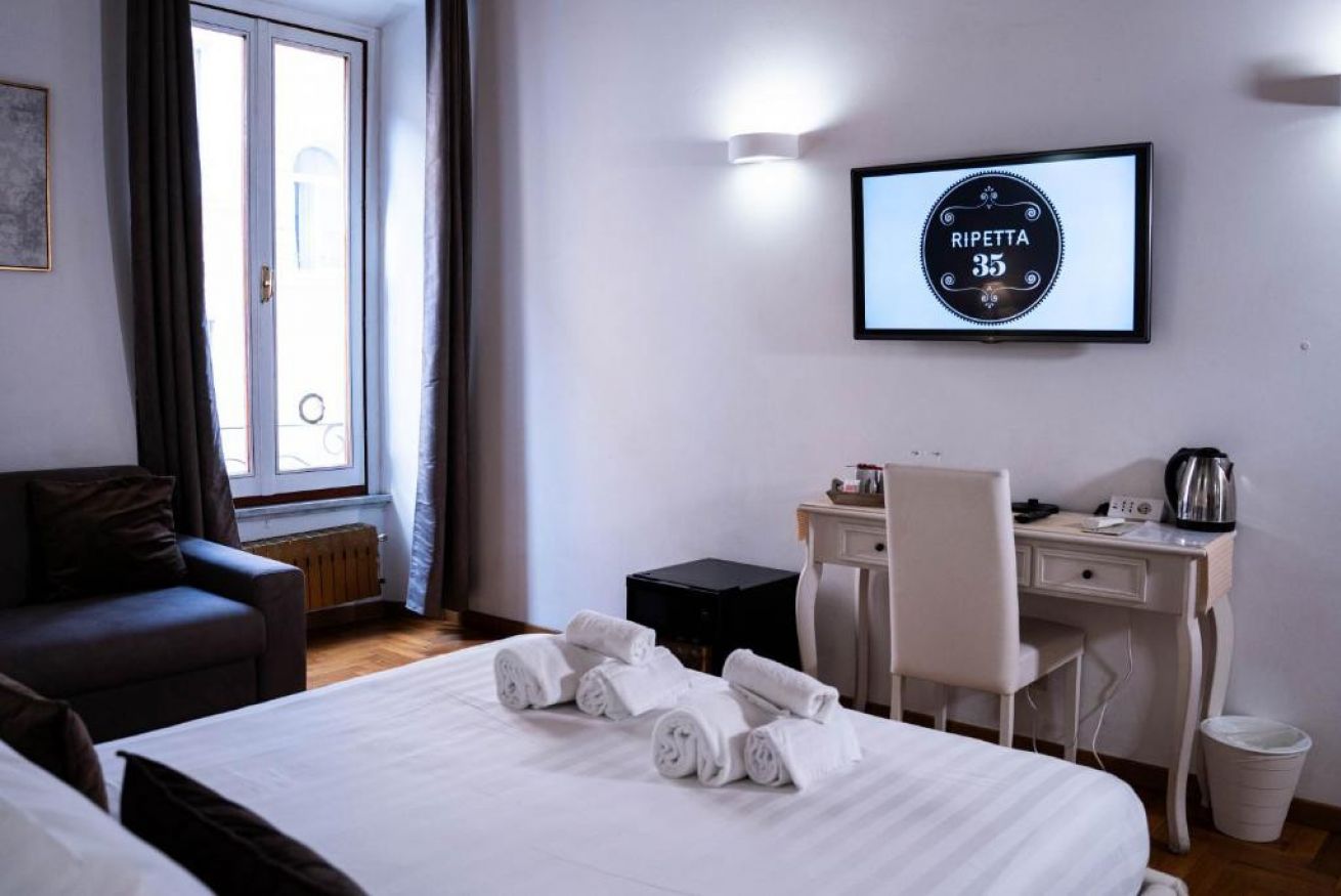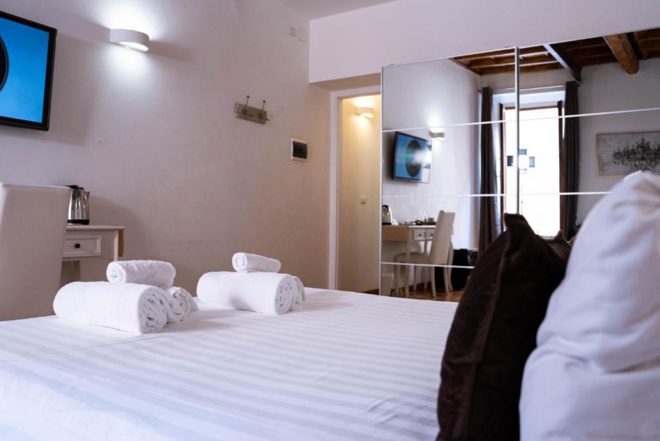Spaziosa ed elegante camera con parquet ,travi a vista con bagno privato. Gode di tutti i confort come aria condizionata,wi fi gratuito, minibar, bollitore elettrico, asciugacapelli, set cortesia bagno, divano . Affaccio su Via di Ripetta . Soluzione perfetta per chi desidera spazio e confort nel centro della Città Eterna.